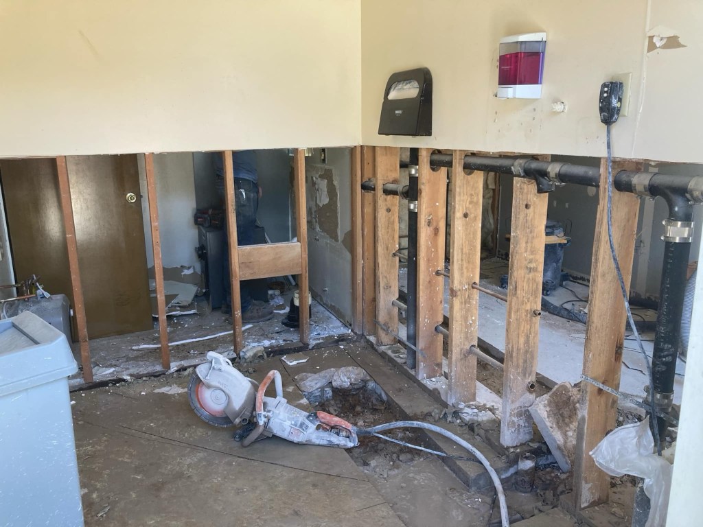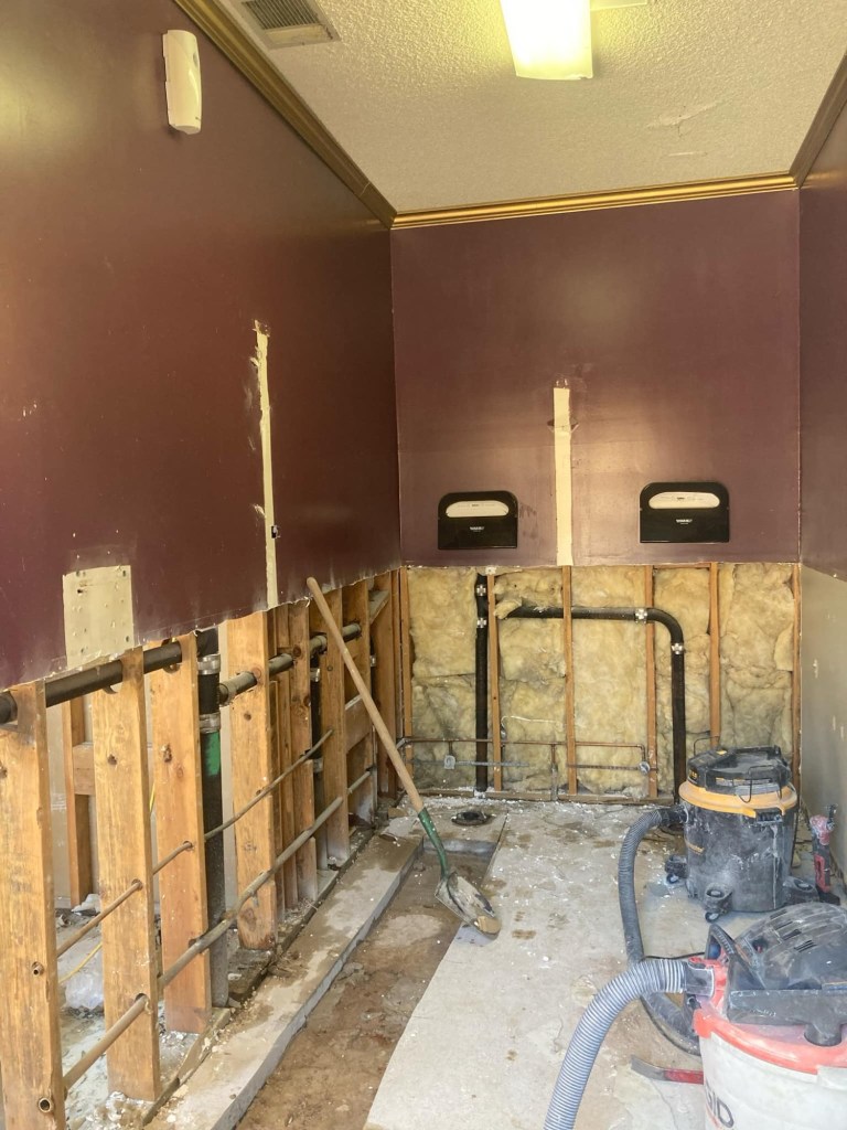 Brad is continuing to button up the Ministry Connect house – just waiting on a propane tank. His crew (Tyler and Caleb) is also continuing to work on another staff house. What he’s been really excited about lately though is his new tool trailer! Camp was able to purchase a small trailer that Brad has made into a mobile tool container and work station. He was even able to weld a hitch for it! This is an enormous help for him to be able to bring bigger tools to a job site and leave them there rather than hauling and storing them every day or leaving them on the site. He has it on his current project, which is remodeling the Broken I bathrooms. These are the oldest bathrooms on property; they have only had minor improvements made to them since the late 1980’s. The goal of the project is to create four single-use restrooms. Gone are the purple and gold women’s restroom and the single-stall men’s room! Woohoo!